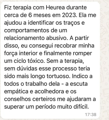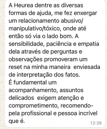 Olá! Eu sou Heurea Gonçalves, psicóloga especializada em Terapia Cognitivo Comportamental e apaixonada por ajudar mulheres a retomarem o controle da própria história.